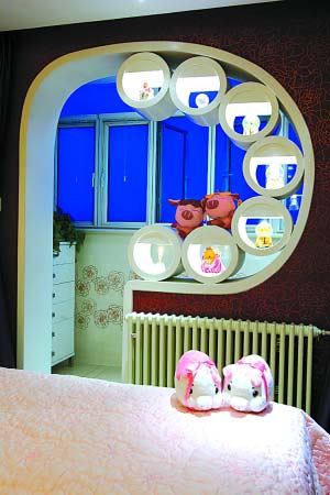 一進(jìn)門就能看見(jiàn)的“照片門”,就是把兩個(gè)人的婚紗照噴繪在門上;客廳電視墻里面藏著玄機(jī),展示著馬天婧最愛(ài)的婚紗,還有滑動(dòng)門上兩個(gè)人復(fù)古宮廷裝的婚紗照;衛(wèi)生間是崔鵬的最愛(ài),可以變色的馬賽克地面、仿佛“水立方”感覺(jué)的泡泡馬賽克;餐廳里大膽的顏色和淘來(lái)的水晶燈;還有臥室里印花紅色壁紙和羽毛燈……讓這個(gè)小家有著無(wú)處不在的甜蜜、浪漫和溫馨。