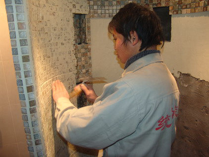 沐浴房安裝的嵌入式花灑是在鋪貼馬賽克之后,師傅們?cè)阡佡N工作中細(xì)致地劃分區(qū)域預(yù)留位置。
