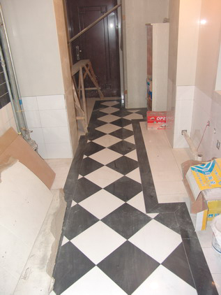 除了現(xiàn)場(chǎng)的施工質(zhì)量,其它方面,我們也都有嚴(yán)謹(jǐn)規(guī)范的制度。為了保護(hù)已經(jīng)鋪裝好的地磚,師傅們?cè)谏厦驿佋O(shè)了厚厚的紙板。